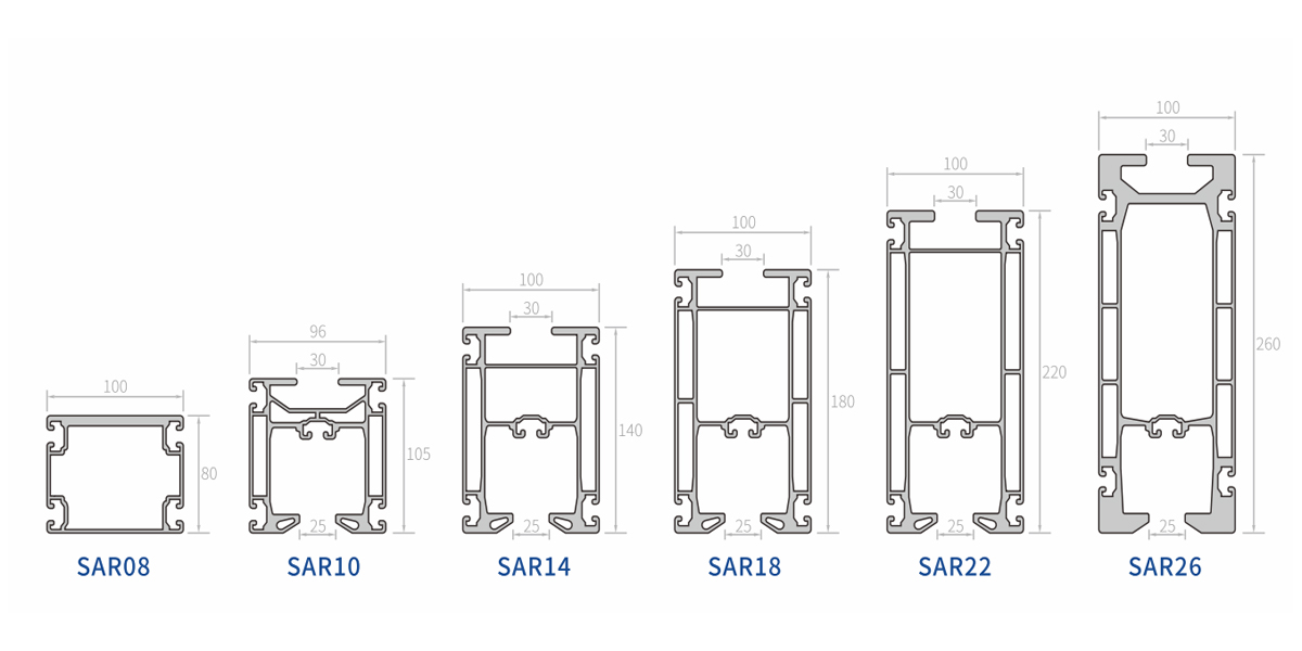 | SAR08 | Aluminium, dianodisasi | 4.1KG/m | 152cm^4/202cm^4 | 30cm^3/40cm^3 |